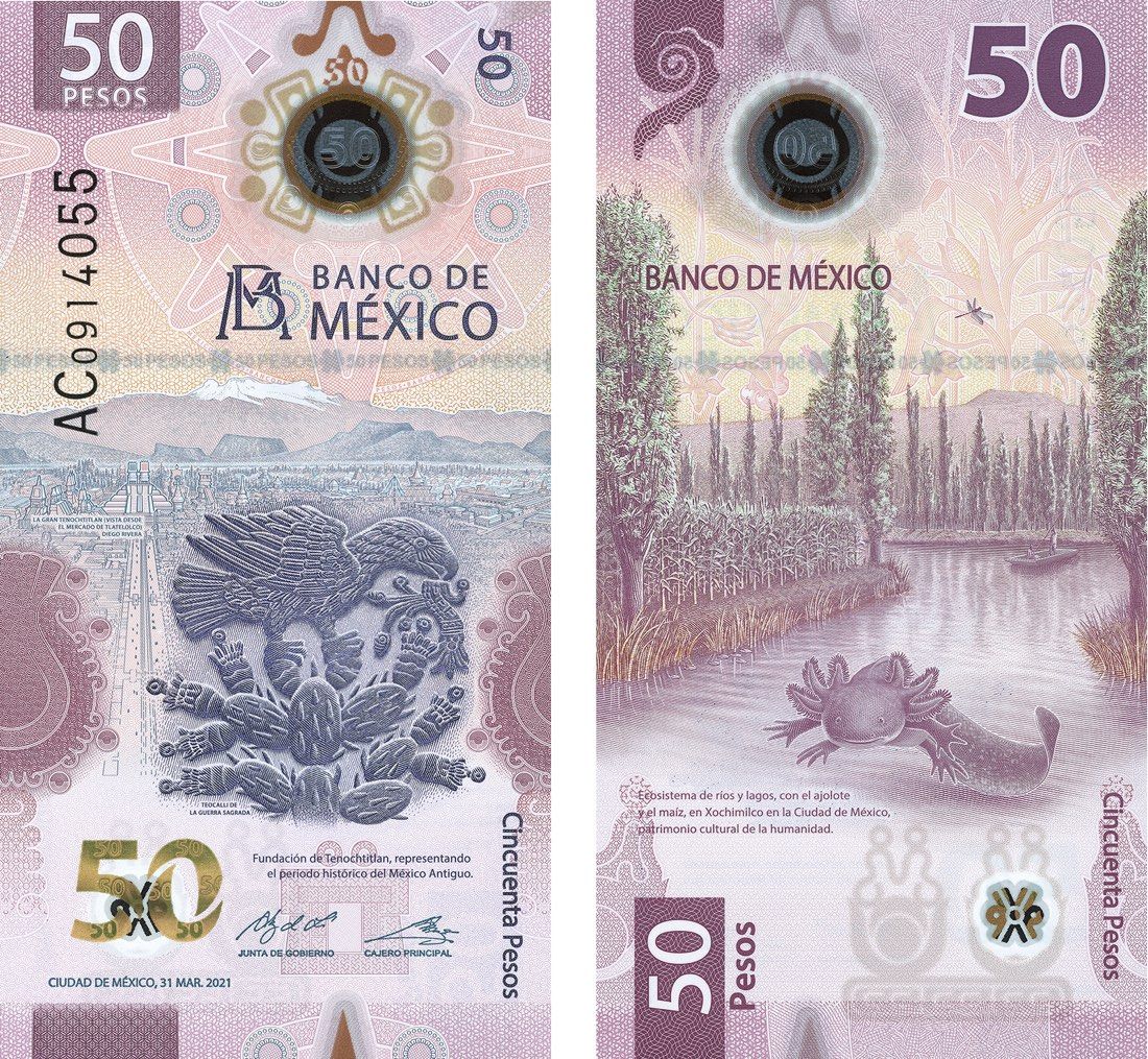 The front of the new $50 note shows the foundation of Tenochtitlan the capital of the Aztec empire. According to legend, the city was established by the Mexica tribe in the place where they found an eagle devouring a snake. This image is also depicted in the front of the note. The main motif of the back of the note is the “ajolote” a salamander found in several Mexican lakes and waterways, such as Xochimilco, which is also depicted as part of its habitat. This salamander is notable among amphibians because they reach adulthood without undergoing metamorphosis.