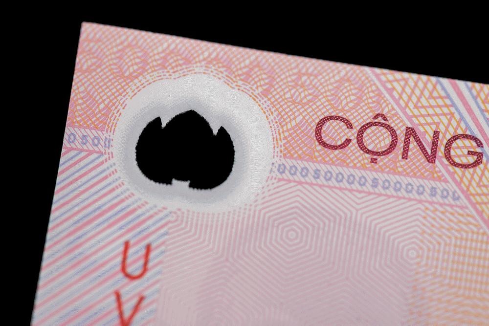 VIGNETTE™ is a distinctive printed design of opaque inks within a window. It is visible when a banknote is held flat (in transmission) or at an angle (on reflection). VIGNETTE adds complexity by interacting with other security features or design elements near the window’s edge. In a full window, the feature is visible from both sides of the banknote.