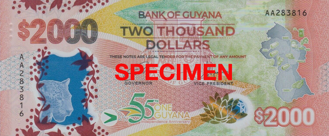 The design of the note incorporates images that not only look to the country’s past, but also to its future and its environment. Images include a map of Guyana, the country’s national animal – the jaguar.