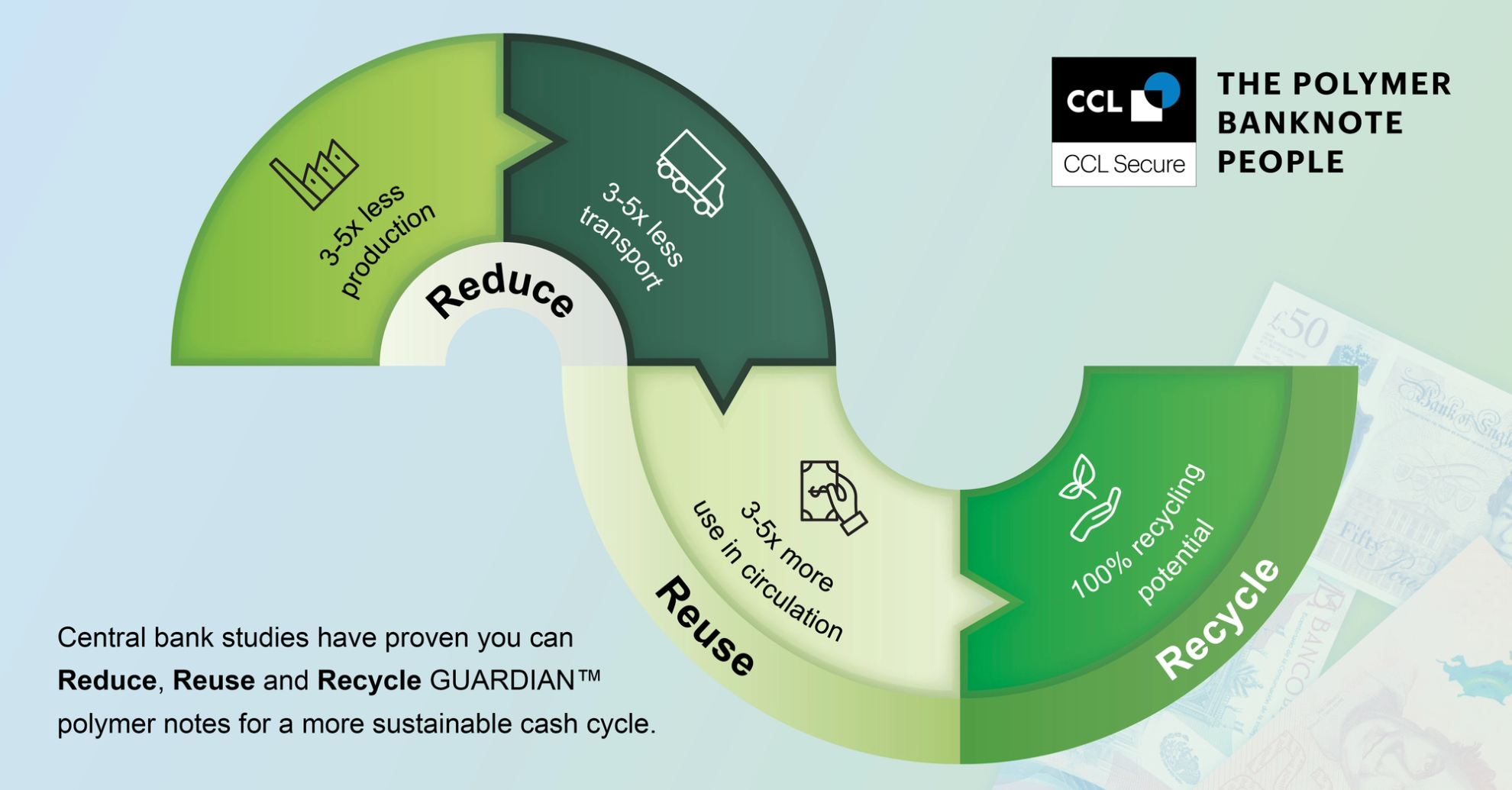 Banknotes can be thought about in the same way that we tackle all products: reduce, reuse, recycle.
